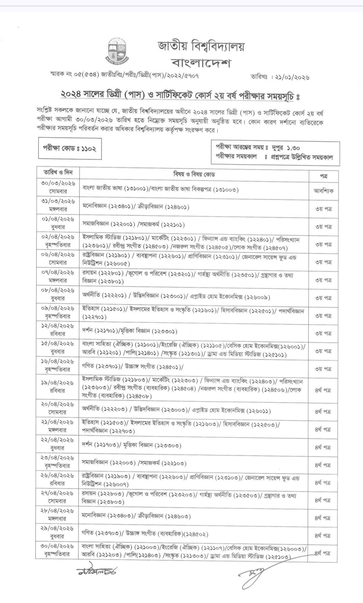 ২০২৪ সালের ডিগ্রী (পাস) ও সার্টিফিকেট কোর্স ২য় বর্ষ পরীক্ষার সময়সূচি |