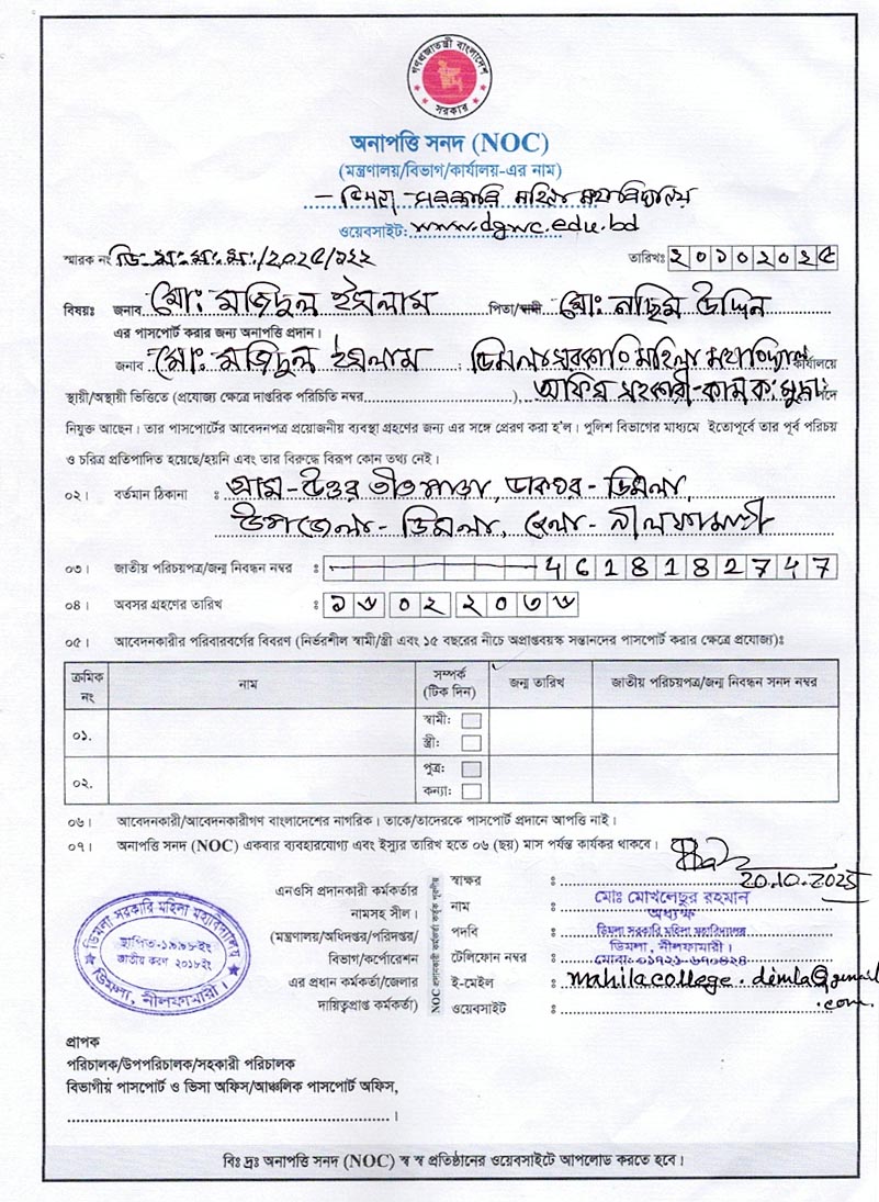 জনাব মোঃ সাইদুল ইসলাম প্রভাষক এর পাসপোর্ট করার অনুমতি প্রদান প্রসঙ্গে। |